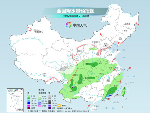 后天,新疆沿天山地區、青海東南部、川西高原北部等地部分地區有小雪或雨夾雪。陜西中部、河南西部、湖北南部、湖南西北部、四川南部、云南東北部、福建東南部、廣東東南部、臺灣島等地部分地區有中到大雨,其中,廣東東南部沿海等地部分地區有暴雨。