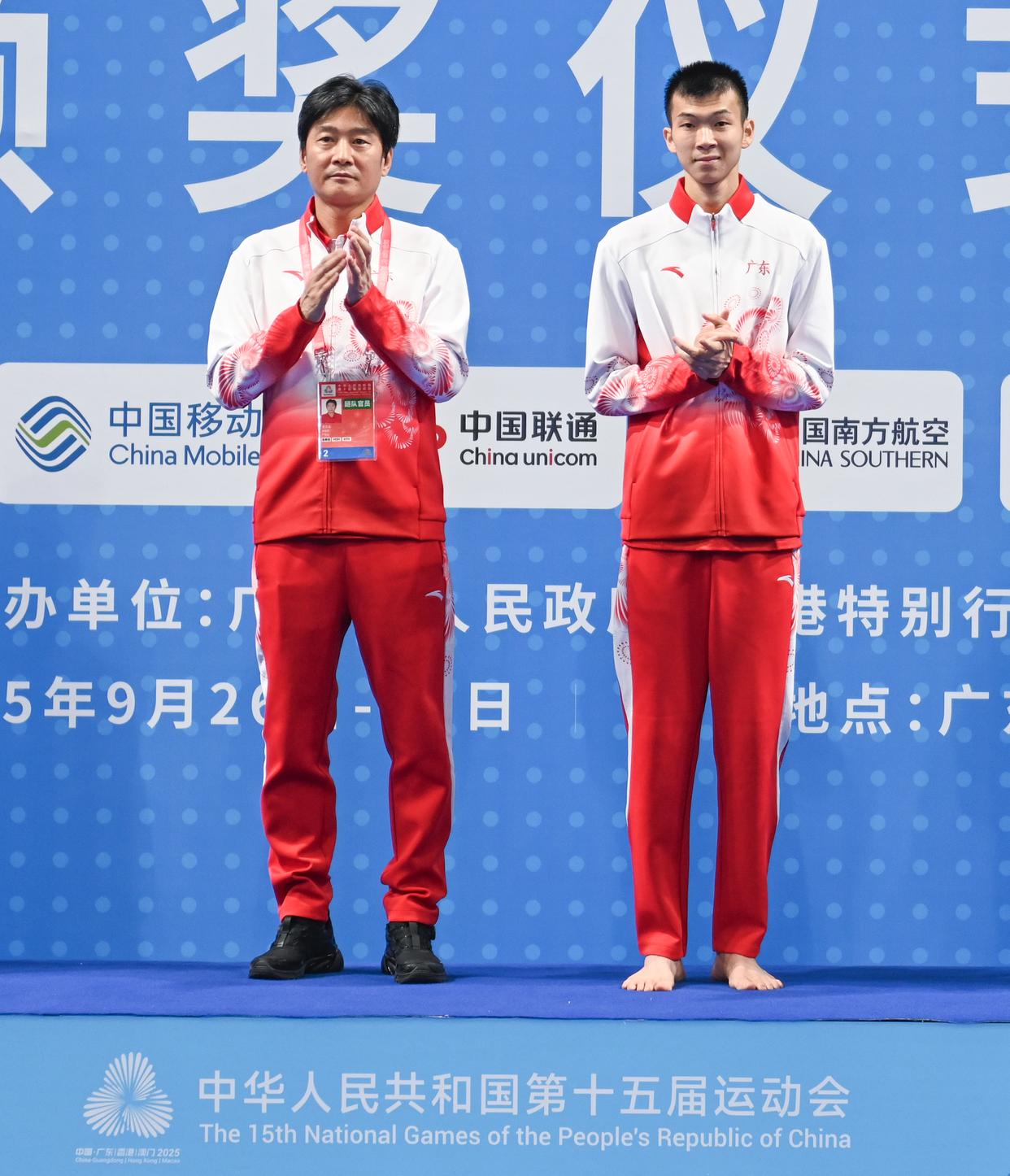 黃科奮(右一)與教練一起領獎。(新華社圖片)