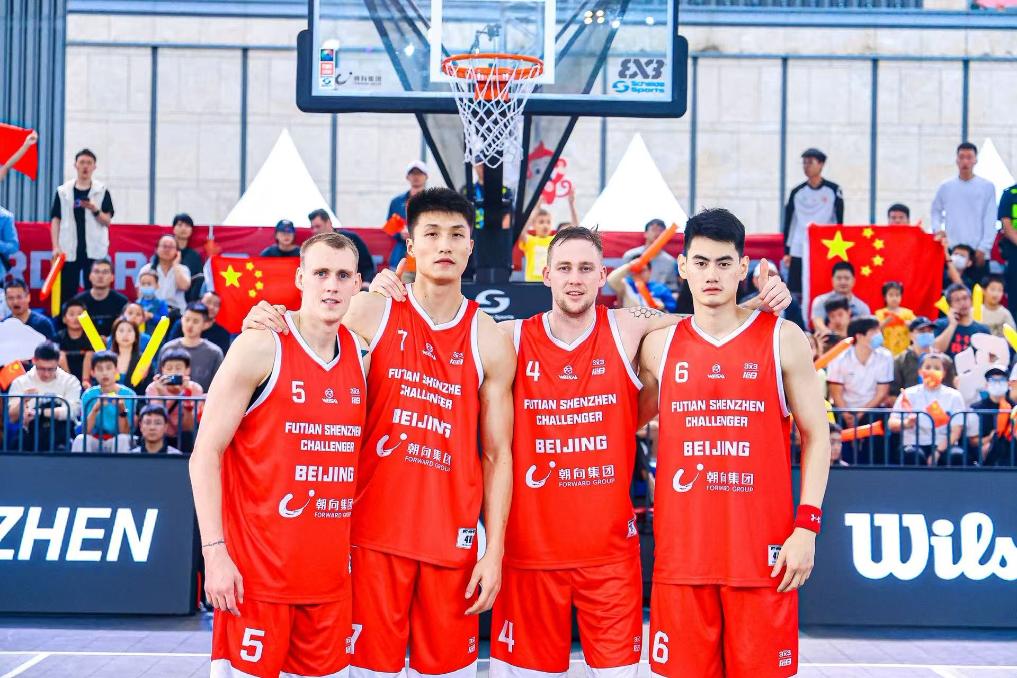 中國球員顏鵬(右一)、朱淵博(左二)和拉脫維亞球員拉斯馬尼斯(右二)、米耶茲斯組成的中國北京隊絕殺塞爾維亞利曼隊,奪得2023國際籃聯三人籃球(3×3)挑戰賽深圳福田站冠軍。受訪者供圖