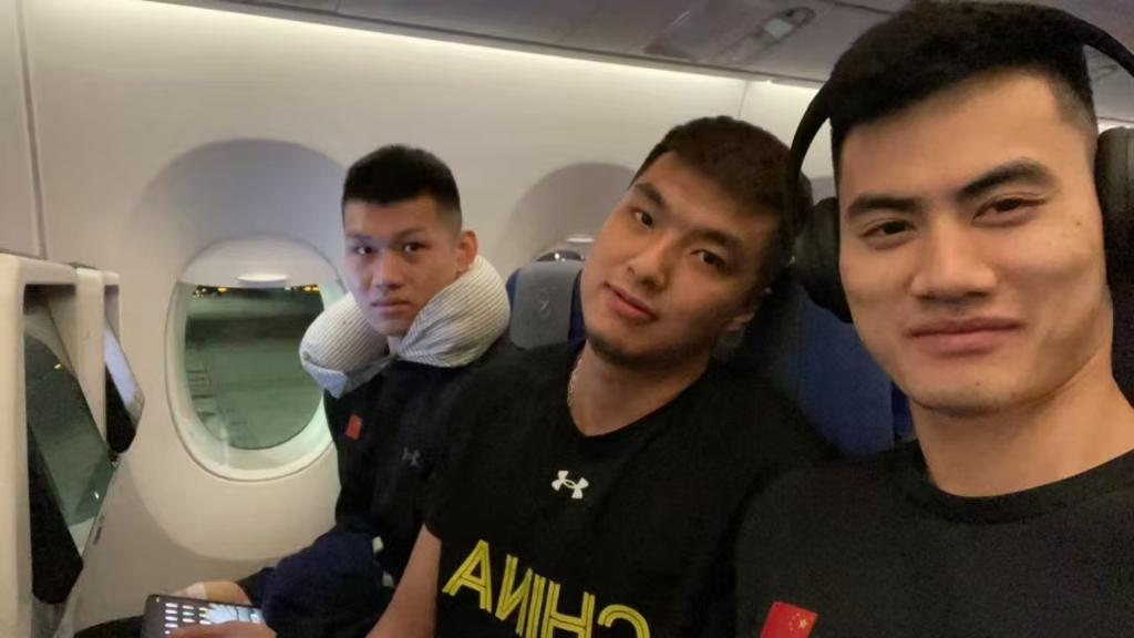 顏鵬(右一)與上海隊隊友周彥旭(右二)、吳星銳在從塞爾維亞飛往泰國參加泰國超級聯賽的飛機上。受訪者供圖