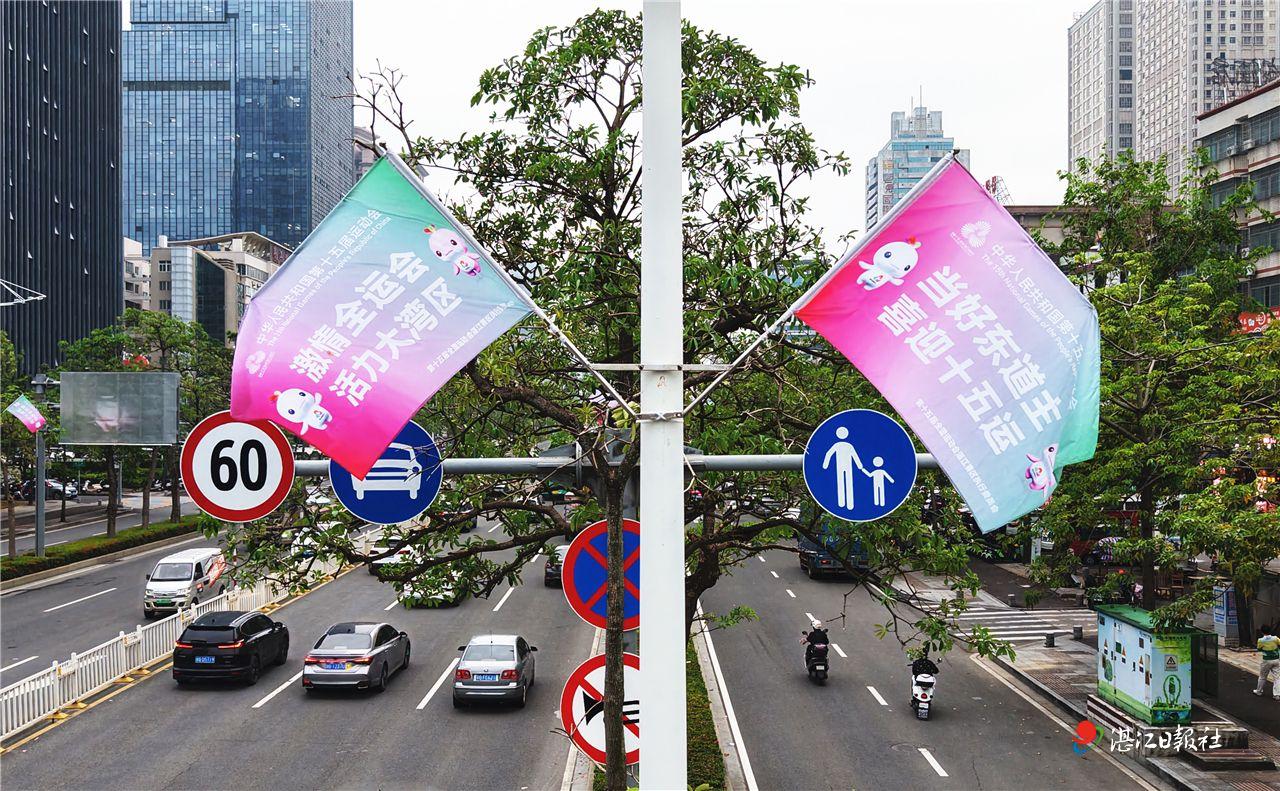 10月29日,第十五屆全國運動會宣傳彩旗已在湛江開發區樂山路亮相,為城市增添了濃厚的喜慶氛圍。