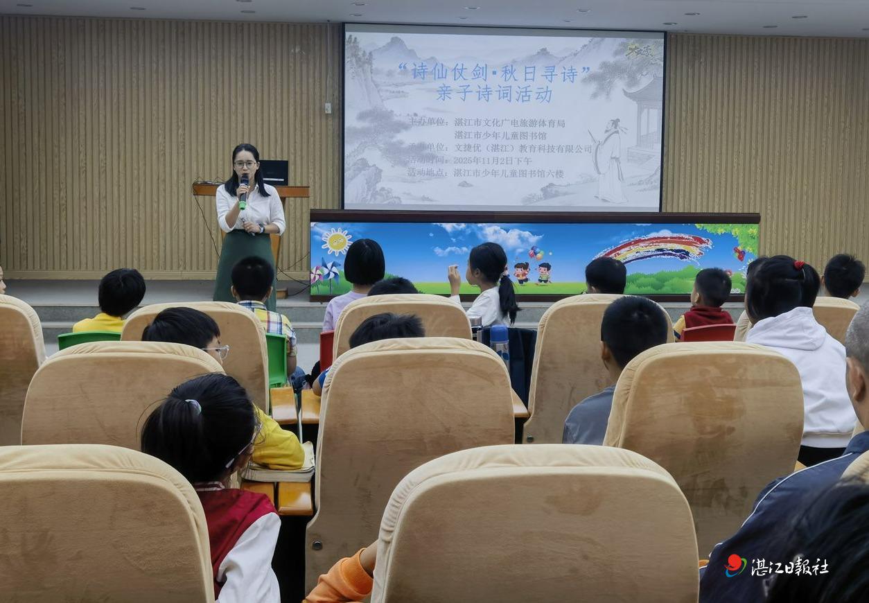 11月2日下午,一場主題為“詩仙仗劍?秋日尋詩”的親子詩詞活動在市少年兒童圖書館舉行。活動現場氣氛熱烈,32組親子家庭在詩的海洋中穿梭,共同開啟了一場穿越千年的文化尋旅,感受中華古典詩詞的永恒魅力。