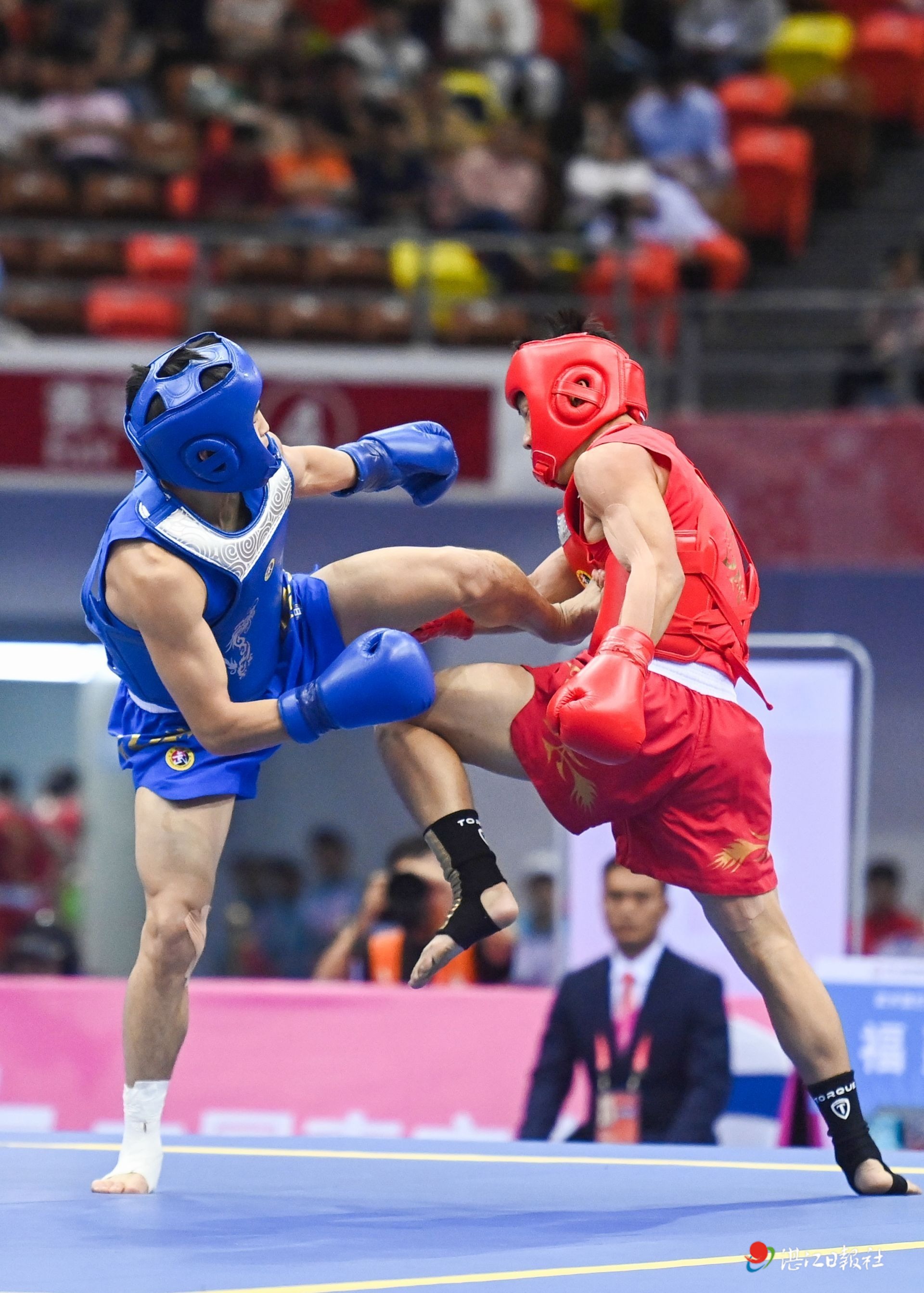 十五運會武術(shù)散打男子60公斤級決賽,江蘇隊唐思碩(藍方)2:1戰(zhàn)勝福建隊的黃家駿,奪得冠軍。